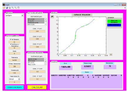 En esta parte se hace especial énfasis en la variación de datos relacionados con los aspectos químicos, que conllevan a cambios en la forma de la curva de titulación, y en la equivalencia entre variables numérico-computacionales y las propiamente químicas. Manteniendo los datos numéricos de entrada (a menos que se indique explícitamente lo contrario), se verificará la calidad del ajuste de los métodos comparados, variando la concentración o la naturaleza de las sustancias químicas involucradas.