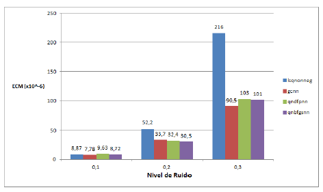 Para una concentración fija del reagente (NaOH) en 0,2 M, se procede ahora a variar en el simulador el valor de la concentración de las sustancias del influente (parámetros a estimar o conjunto solución), sin presencia de ruido. Los resultados se pueden ver en la figura 12. Según el análisis de la varianza no existe para los dos primeros casos una diferencia significativa entre las medias de los errores cometidos por cada método; mientras que para las concentraciones de 1 M y 2 M de los ácidos presentes en el influente, clorhídrico y acético, respectivamente, ese mismo análisis arroja como resultado un error de aproximación significativamente diferente para gcnn con respecto a los demás métodos.