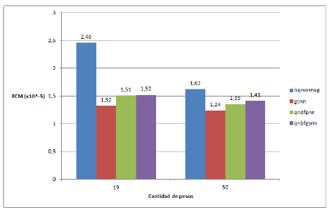 El análisis de la varianza da como resultado, para el caso de 19 pesos, que existe una diferencia significativa entre la media de los errores de aproximación de lsqnonneg y de gcnn. En cuanto al caso de 50 pesos, no existe diferencia significativa entre las medias de los errores de ninguno de los métodos.