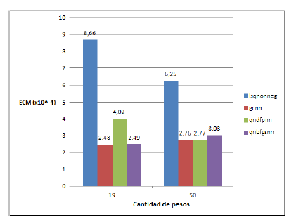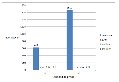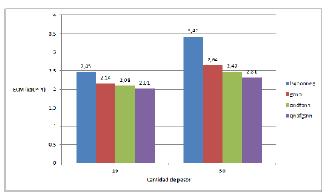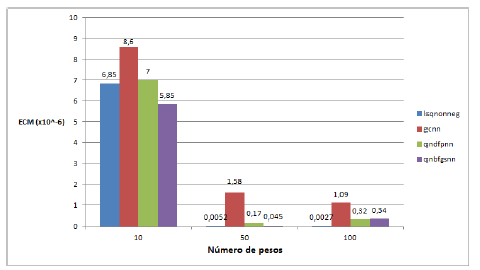 Según el respectivo análisis de la varianza, se tiene que para el caso de 10 pesos no existe una diferencia significativa entre los errores medios de cada método, mientras que para 50 y 100 pesos el error medio de gcnn es significativamente mayor que el de los demás métodos. Es de resaltar aquí que, a pesar del aumento del número de pesos (de 50 a 100), los métodos Quasi-newton aumentaron su error de aproximación.