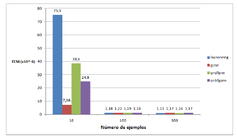 Ahora, tomando en cuenta la calidad en el ajuste de los métodos comparados, al aumentar el número de ejemplos de entrenamiento, se tiene una mejor respuesta para lsqnonneg; aunque, en general, a partir de cierto número de ejemplos, todos los métodos mejoran en muy poco su precisión. No obstante, cuando lo que se incrementa es el número de pesos, es notable la mejora en el ajuste de lsqnonneg (método que aproxima la función objetivo mediante funciones lineales), mientras que los métodos propuestos (métodos que aproximan la función objetivo mediante funciones cuadráticas), ante un número elevado de pesos, pueden aumentar su error de aproximación, debido a la mayor tendencia a sufrir de sobreajuste por parte de estos métodos no lineales.