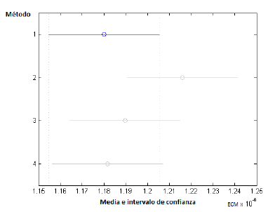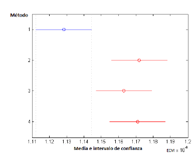 Se aplican las herramientas para el análisis de la varianza (ANOVA) de Matlab , Anova1 y multcompare, donde para cada método se obtiene la media de sus EMC (círculo) y su respectivo intervalo de confianza de 95% (segmento horizontal). Tomando como método 1 el lsqnonneg, método 2 el gcnn, método 3 el qndfpnn y método 4 el qnbfgsnn, se tiene que para 10 ejemplos no se producen diferencias significativas entre los errores medios arrojados por cada método, tal como se puede observar en la figura 6 (gráfico aportado directamente por la función multcompare). Para 100 ejemplos tampoco se producen diferencias significativas entre los distintos errores medios (ver figura 7). En cuanto al caso de 500 ejemplos, el método lsqnonneg presenta un error de aproximación significativamente menor que los demás (ver figura 8).