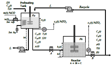 El proceso consiste en un tanque de precalentamiento seguido por un reactor donde ocurre la siguiente reacción endotérmica A→2B+C. La fig. 9 muestra el esquema del proceso en estudio.