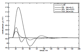 En la fig.11 se presenta el desempeño de las mismas estrategias de control enfrentando una perturbación de naturaleza diferente a la variable intermedia, la concentración del reactivo A en este caso, a la entrada del tanque de precalentamiento. Se puede observar en esta figura que las estrategias especialmente diseñadas para control en cascada (2PIs y FCIV) muestran un pobre desempeño en el control de la variable principal, cuando enfrentan un cambio de 20% en la concentración de CAi (t). El desempeño del PID es muy superior a cualquiera de las dos estrategias diseñadas para control en cascada para enfrentar dicha perturbación.