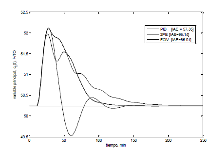 En los trabajos realizados por García (2006) sobre este proceso se compararon diferentes estrategias de control para enfrentar cambios de temperatura en la entrada al tanque de precalentamiento, mostrando el FCIV el mejor desempeño para enfrentar perturbaciones de esta naturaleza. Fig. 10 muestra el desempeño de diferentes controladores enfrentado un incremento de 10 oF (5.56 K) en la temperatura el flujo de alimentación a la entrada del tanque de precalentamiento. Se puede apreciar en la figura que el FCIV presenta menor desviación con respecto a la variable deseada, con tan solo un valor del integral absoluto del error (IAE) de 4.28; además muestra claramente la ausencia de oscilaciones, lo que le da mayor estabilidad al sistema de control.