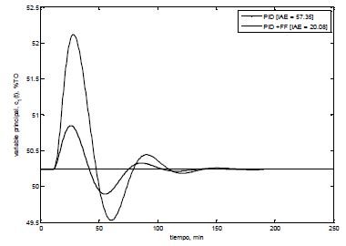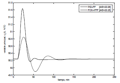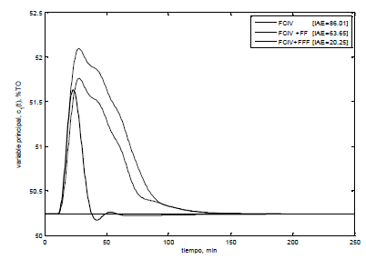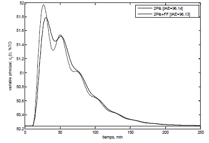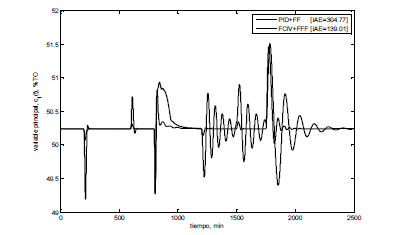 Se puede apreciar en la fig. 16 que el controlador FCIV+FFF presenta mucho menos oscilaciones en la respuesta que el PID+FF, dándole una mayor robustez al sistema de control del proceso en estudio, tanto para cambios de temperatura en la alimentación como para cambios en la alimentación al tanque de precalentamiento, CAi(t), perturbación seleccionada para aplicar control por acción anticipada.