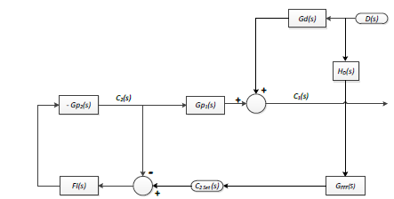 Para determinar la función de transferencia del controlador entre el cambio en una perturbación y el set point de la variable intermedia, GFFF(s) se procede a desconectar el módulo FLC. El modelo simplificado para este propósito se muestra en la figura 8.