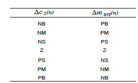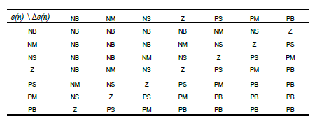 La matriz de reglas difusas usada para el FLC se basa en la matriz diseñada por Macvicar-Whelan (Macvicar- Whelan 1976). Las variables lingüísticas involucradas son: negativo grande (NB), negativo medio (NM), negativo pequeño (NS), cero (Z), positivo pequeño (PS), positivo medio (PM) y positivo grande (PB). Tabla 1 muestra la distribución de reglas obtenidas para el FLC en función del error de la variable principal, e(n) y su cambio, ∆e(n). n es el tiempo en determinado momento acorde con el periodo de muestreo.