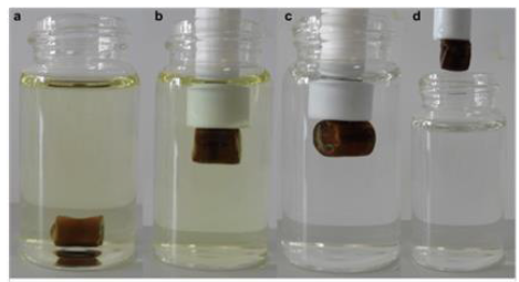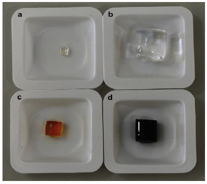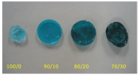 However, the change in coloration is not only observed in the hydrogels, but also the color tone of the solution, as it was reported by Ozay and col. (2011), For poly (4-vinyl pyridine-co-2-hydroxyethylmetacrylate) magnetic hydrogels (P(4-VP-co-HEMA)) used for the adsorption of UO2+2 and Th4+ ions, which are shown in Figure 3.
