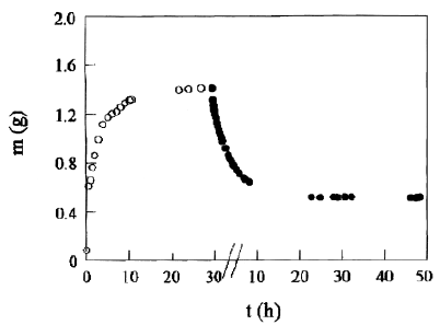Another curious fact was also reported by Katime and col. for the adsorption in a concentrated initial solution of Cu2+ ions. They performed the swelling in water for a certain time, and after that they put the swollen hydrogel in contact with a solution of CuSO4 1x10-2 M, and observed that the hydrogel rapidly deflates until reaching a physicochemical equilibrium (see Figure 11). The authors report that for diluted concentrations of the salt, the swelling curves remain horizontal, whereas for concentrated solutions the hydrogels present a phenomenon of deflagration as seen in Figure 11.