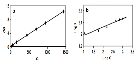 Ozgur Ozay and col. in 2009 studied the adsorption of Pb2+ by hydrogels based on 2-acrylamido-2-methyl-1-propanesulfonic acid (AMPS hydrogels), using the Langmuir and Freundlich models applying equations (2) and (3). Figure 12a and 12b shows the graphs obtained by the authors when applying both models. In the graphs of Figure 12, it can be observed that the linearity is followed for both methods; however the authors report that the data are better with the Langmuir isotherm, so the adsorption is in monolayers, with a homogeneous surface structure and whose adsorption sites are identical.
