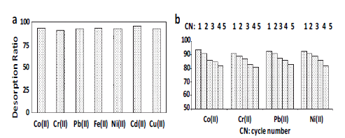 Ozay and col. in 2009, they studied a wider range of metal ion recovery from AMPS magnetic hydrogels. They employed a solution 0.1 M of HNO3 in which the charged hydrogel was immersed with the respective ions and allowed to stir for 24 h and finally determined the concentrations of the metal ions in the solution using the ICP-OES technique. The results found for the desorption of Co (II), Cr (III), Pb (II), Fe (II), Ni (II), Cd (II) and Cu (II) Figure 13.