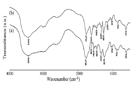Figure 4.a shows that the peak at 3435 cm-1 corresponding to the symmetric stretching vibration of the N-H bond tend to overlap with the stretching of the hydroxyl group (CO-H), in addition it is noticed that the intensity of this peak decreases and moves (from 3435 cm-1 to 3431 cm-1) when the hydrogel is charged with the Cd2+ ion (Figure 4.b). A similar behavior was observed by Dai and col. (2001).