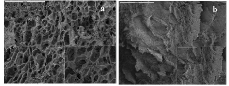 It can be clearly seen in Figure 5 the structural changes that the hydrogel undergoes after interacting with the Cd2+ ion. It is noted in detail that Figure 5a has a highly porous hydrogel whereas in Figure 5b practically the pores disappear or become much smaller. Evidently this confirms that the Cd2+ ions were retained by the hydrogel structure.