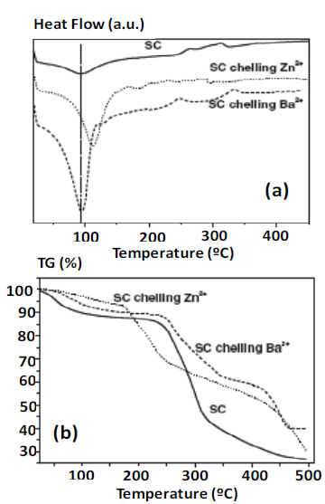 The thermal studies were carried out with the pure hydrogel and charged with Zn2+ and Ba2+ ions, both 1M. The authors chose these cations because of their differences in ionic radius and polarizability. Figure 6 shows the results obtained for both DSC and TG.