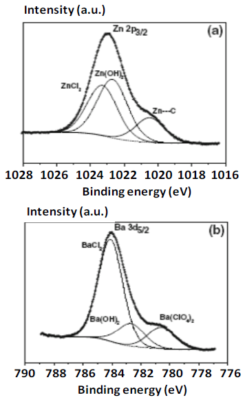 For the study of the adsorption of Ba2+ ions in the polysaccharide matrix, the authors report the following composition: 73% carbon, 18.3% oxygen, 5.6% chlorine and 3.1% barium. Figure 7.b shows a central component at 782.3 eV which is attributed to the interaction between Ba2+ and OH groups (16%). The major component at 784.1 eV corresponds to a possibly barium peak which is not clearly identified, but is probably related to the BaCl2 species; and the third component at 780.6 eV (0.5%) can be attributed to the Ba(ClO4)2 species. Although the presence of Ba(ClO4)2 was not clear or well defined in the hydrogel matrix, the important point is that there are three types of species bound to Ba in the hydrogel matrix.