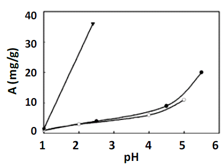 Kasgoz and col. (2001) using acrylamide based hydrogels, which were chemically modified to increase the proportion of chelating groups in their crosslinked structure, observed that Cu2+ ion uptake increases as pH increases. The results obtained indicate that at pH ~ 5.5, it is the optimum adsorption value where the Cu2+ ions interact perfectly with the deprotonated amine groups belonging to the hydrogel crosslinked network.