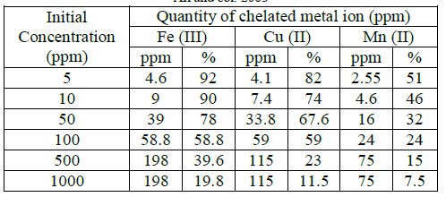 According to the results obtained by El-Hag Ali and col., it is postulated that the VP/AAc hydrogel has a high efficiency in the range of 5-100 ppm where are removed 60 % of the ions Fe (III) and Cu (II) of the solution and about 25% for Mn (II) ions.