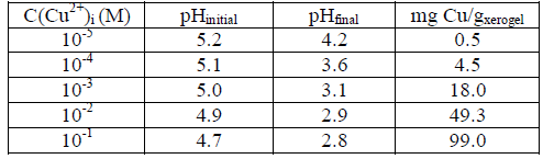 Continuing the pH effect on the hydrogel, Katime and col. in 2001 studied the adsorption of Cu2+ and Zn2+ ions from hydrogels composed of acrylic acid/itaconic acid. The concentrations of the ions in the remaining solutions were determined by atomic absorption spectrophotometry. They found that the presence of the carboxylic groups are responsible for the adsorption of the metal ion from the aqueous solution and postulated that the adsorption of Cu2+ occurs as a cation exchange between the Cu2+ present in the external solution and the H+ ions from the groups acids of the polymer chain, whereas the carboxyl groups in the hydrogel are bound to the metal ion due to electrical exchange. This was checked with the initial and final pH changes of the different Cu2+ solutions as shown in Table 2.
