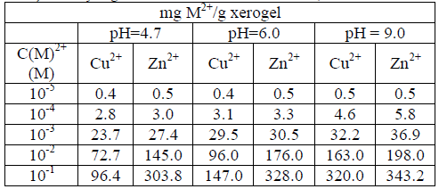 On the other hand, the same authors investigated the adsorption of metal ions by varying the pH of the solution whose results are specified in Table 3. In Table 3 a strong dependence of the adsorption of the Cu2+ and Zn2+ ions with respect to the pH can be observed. That is, as the pH in the solution of the metal ions increases, the pressure of the ionic swelling becomes larger due to the increase in the production of free ions by the dissociation of the -COOH groups in the hydrogel.