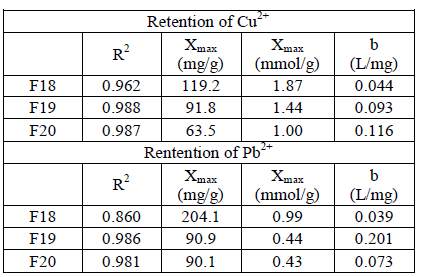 García and col. determined the X values and performed the Langmuir adsorption isotherms by applying equation (2) for poly(N-[3- (dimethylamino) propyl] methacrylamide) hydrogels (the proportions of the hydrogels are specified in Table 4) for the retention of Cu2+ and Zn2+ whose results are shown in Table 5.