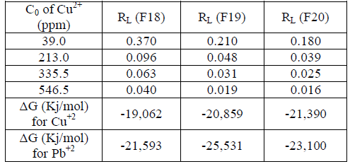 (4)This value predicts whether the adsorption system is irreversible (RL=0), favorable (01). With the value of b one can also determine the ΔG of the metal-hydrogel junction for each of the matrices, according to the equation given below: