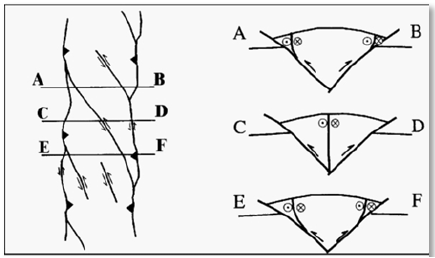 Experimentalmente se han realizado modelos numéricos y analógicos desarrollados sobre estructuras explicativas asociadas a sistemas transcurrentes para entender mejor estas estructuras observadas en terreno como el caso de la figura 14 (González 2004) que muy bien se adapta a nuestro estudio y explicaría los pliegues de El Empedrado, Santa Bárbara, Nunca Jamás y Los Aposentos.