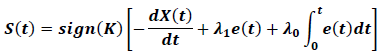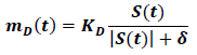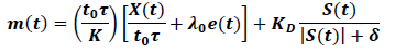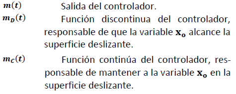 La parte discontinua 𝒎D(𝒕) incorpora un elemento no lineal que incluye el elemento de variación de la ley de control. Esta parte del controlador es discontinua a través de la superficie deslizante.
