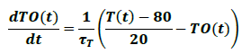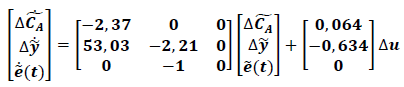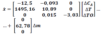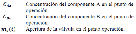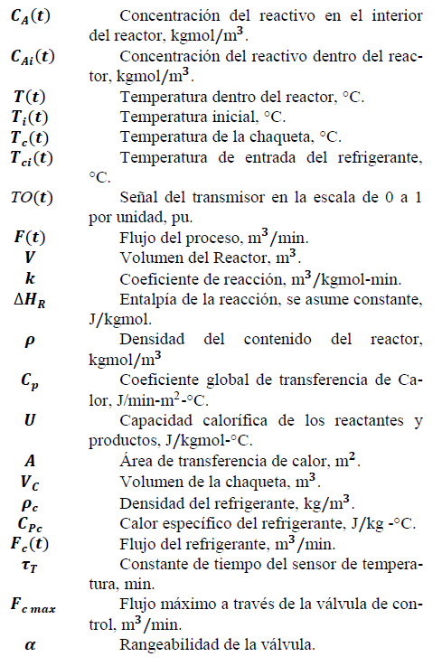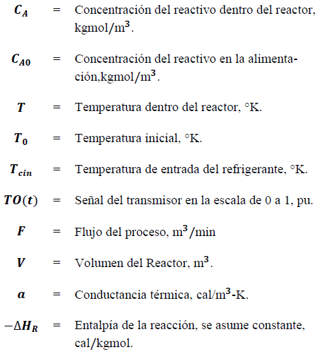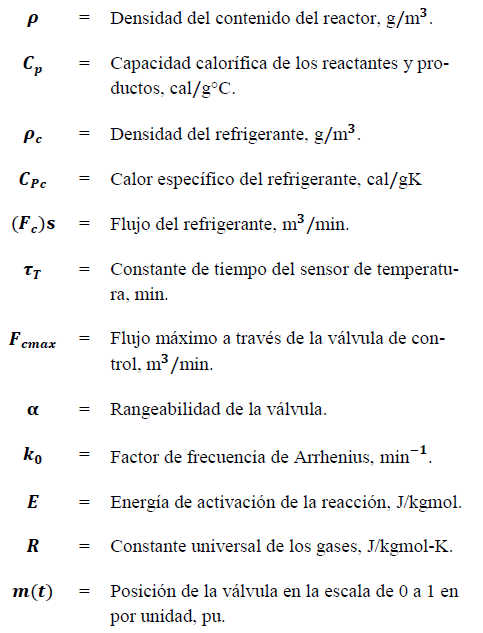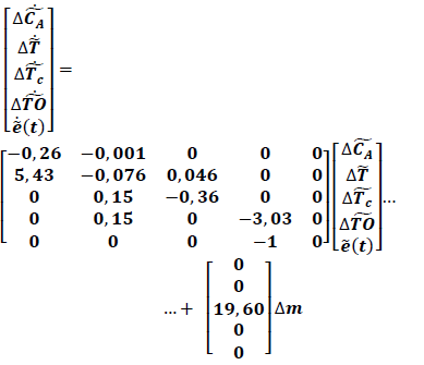 Donde 𝒙̃(𝒕), 𝜺̃(𝒕) y 𝒎̃(𝒕) son las variables que se obtienen restando sus valores de estado estacionario 𝑿𝒔, de sus valores temporales, pero que en el caso de 𝜺̃(𝒕) se los considera igual que 𝜺(𝒕) dado que el valor en estado estacionario del error debe ser igual a cero, y el valor de 𝑪 es la matriz de salida del respectivo sistema, que en el caso de los reactores, es la fila correspondiente al transmisor de temperatura o de concentración.