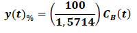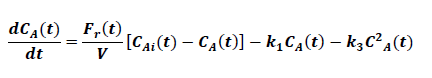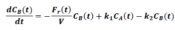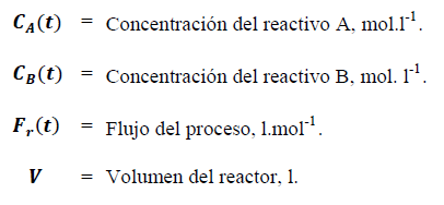 En este caso la variable de interés será la concentración del componente B en el reactor, la cual se busca controlar a través del flujo 𝑭𝒓(𝒕), las tasas de reacción se encuentran representadas por 𝒌𝟏, 𝒌𝟐 y 𝒌𝟑 respectivamente las cuales fueron tomadas de (Alfaro y col., 2017). Para la medición de parámetros el reactor modelado cuenta con un transmisor de concentración el cual se lo puede representar por medio de la ecuación 31, este transmisor tiene la particularidad de ser lineal y dar una medida representada en porcentaje. Para el control se cuenta con una válvula representada por la ecuación 32 que regula la salida del flujo 𝑭𝒓(𝒕), cabe indicar que para esta planta los cambios máximos de alimentación del reactante A deben ser de ±10%, y las perturbaciones en 𝑪𝑨𝒊 deberán estar entre ±10%, las ecuaciones de estos dispositivos son tomados de (Alfaro y col., 2017).