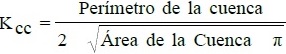 · Índice de Gravelius (Kcc): se define como el cociente entre el perímetro de la cuenca y le perímetro del circulo de superficie equivalente. Este parámetro cuantifica la forma de la cuenca.