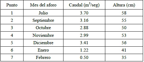La tabla 4 resume el resultado de los caudales obtenidos por el método del aforo diluido con su respectiva altura de agua.