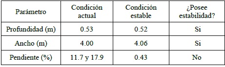 Al analizar los resultados de la tabla 5 se observa que, si bien la profundidad y el ancho del cauce coinciden con los valores de estabilidad, existe una gran diferencia en cuanto a la pendiente física y la pendiente estable. Esto indica que el río buscará la estabilidad formando meandros a fin de reducir la pendiente.