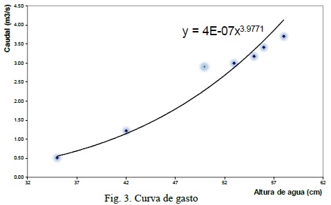 El tipo de modelo o función matemática que relaciona las dos variables puede ser, en principio, cualquiera, pero una vez graficados los puntos se observa que la función potencial mostrada en la figura 3, es la más adecuada, ya que cuando el nivel del agua sea cero el caudal debe ser nulo.