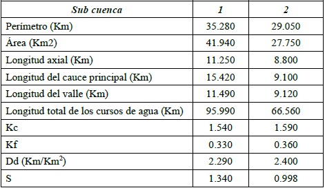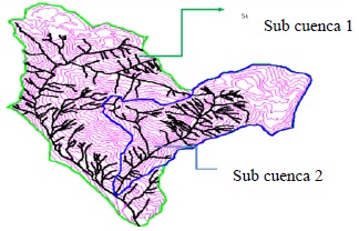 El índice de Gravelius, mayor que 1, indica un mayor alargamiento en la forma de la cuenca, es decir un ensanchamiento en el extremo superior, definida por la sub cuenca 2, tal como lo indica la figura 1.