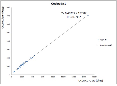 Donde Y es el caudal correspondiente a la quebrada 1 y X el caudal total. Esta ecuación permite estimar el caudal total con solo tener como información el caudal en la sub cuenca 1, donde el gasto debe ser menor o igual al caudal total. Para valores bajos de caudales, menores a 0.35 m3/s del caudal total, la ecuación no es confiable.