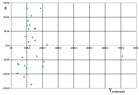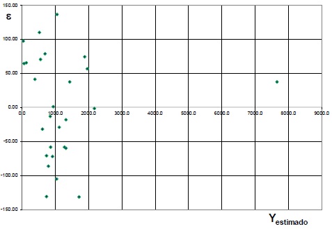 Las dos variables de la figura 3 necesitan estar relacionadas, por lo que se puede validar su modelo matemático no lineal, al graficar el error contra el Caudal estimado. En este caso, lo ideal es que no se presente ningún patrón definido.