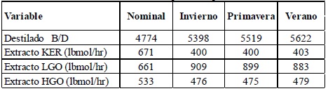La tabla 3 muestra los resultados de las variables manipuladas para cada escenario. En el escenario Inviernose puede observar que la corriente Extracto LGO aumenta con respecto a su valor nominal, reflejándose éste, en un incremento de la producción de LGO del 12,1% (ver tabla 4). En este escenario el LGO tiene mayor precio de venta. La producción del LGO se incrementa disminuyendo la producción de Kerosén hasta que el límite mínimo de la variable manipulada Extracto KER es alcanzado. La producción de Kerosén disminuye del 7,9% al 4,1 %. La Nafta presenta un pequeño incremento con respecto a su valor nominal.