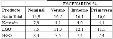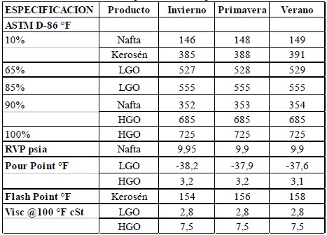 En el escenario Verano, la Nafta tiene mayor precio de venta. La producción de Nafta se incrementa de un 15,9% a un 16,6% como se muestra en la tabla 4. La producción de LGO aumenta también, pero en menor proporción que en el escenario Invierno, incrementándose de un 7,5% a 11,3%. El aumento de la producción de la Nafta, se produce agregando Kerosén a la Nafta hasta que la especificación de calidad D86-10% de la Nafta alcanza su límite máximo de 149 oF, como se muestra en la tabla 5.