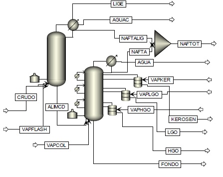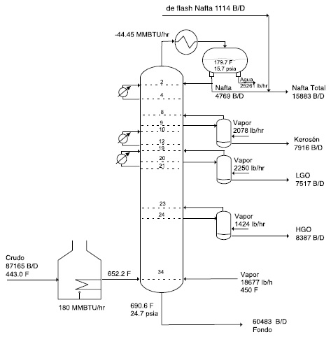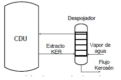 La CDU tiene 34 etapas, un condensador total, 3 despojadores y 3 circuitos de enfriamiento intermedio (pumparound). Los separadores tienen 4 etapas cada uno, y son utilizados para retirar los componentes livianos. El primer despojador es alimentado con un caudal de líquido extraído de la etapa 10 de la columna, se obtiene como producto Kerosén, y los vapores de hidrocarburos desprendidos se retornan a la etapa 9 de la CDU, por arrastre directo con vapor de agua que alimenta al despojador. De forma similar, pero de la etapa 20, se extrae LGO de la CDU y se envía al segundo despojador, los vapores del despojador se regresan a la etapa 19. De la etapa 24 se retira HGO y se envía al tercer despojador y los vapores del despojador se regresan a la columna en la etapa 23, como se muestra en la figura 2.