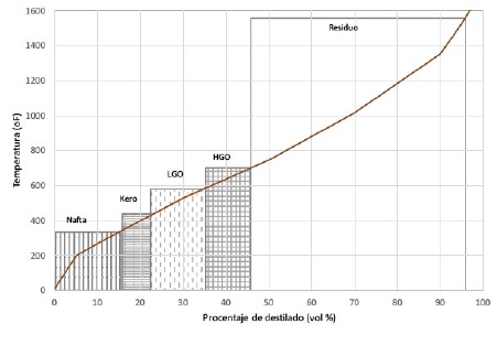 El rendimiento inicial de los productos seobtienea partir de la curva de punto de ebullición verdadero(TBP) del crudo ecuatoriano, en términos de intervalos de temperatura, como se muestra en la figura 3. Los cortes de temperatura correspondiente a cada producto se establecieron de la siguiente manera:a) Nafta: hasta330 °F; b) Kerosén: 330-480°F; c) LGO: 480-580 °F; d) HGO 580-690 °F e) Residuo atmosférico 690+°F. Estos cortes definieron el flujo volumétricodecada producto como se muestra en la figura 2.
