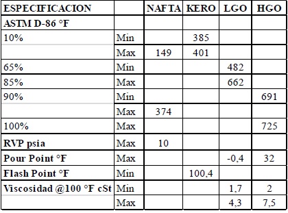 donde es el beneficio obtenido a partir de la función objetivo, Pi es el precio de venta del producto obtenido en el sistema de destilación en galones. Los xi, representan las restricciones definidas en la tabla 1, donde xi equivale a la temperatura ASTM-D86 10% (F°),x2equivale a la temperatura ASTM-D86 90% (°F),x3 equivale a la temperatura ASTM-86 65% (°F),x4 equivale a la temperatura ASTM-86 86% (°F),x5 equivale a la temperatura ASTM-86 100% (°F),x6 a RVP (psia),x7al flash point (°F),x8 al pourpoint (°F),x9a la viscosidad absoluta (cP),y los indices "n", "k", "V", "h", representan a la nafta, kerosén, LGO y HGO.