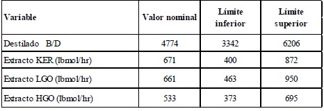 Los límites de las variables manipuladas están basados en restricciones de diseño y en los requerimientos mínimos de producción de cada subproducto (ver Tabla 2).