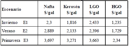 El proceso de destilación de crudo se evaluará en tres escenarios: verano, invierno y primavera, relacionados con la diferencia del precio del LGO con respecto a la Nafta en unafecha determinada.En el escenario Invierno, el precio del LGO es superior a la Nafta, en el escenario Verano el precio de la Nafta es superior al del LGO, y en el escenario primavera los precios de la Nafta y LGO tienden a ser similares. Los precios de los diferentes productos se presentan en la tabla 3, y fueron obtenidos del histórico de los precios de combustibles en la Costa del Golfo USA (EIA, 2016).