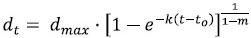 (4)donde,dt= diámetro al tiempo t (cm), dmax= diámetro máximo que puede alcanzar un árbol de la especie (cm), to = tiempo inicial de medición del diámetro (años), t = edad (años), k= parámetro que se relaciona con la tasa de crecimiento e indica la velocidad a la cual se aproxima el diámetro del árbol al diámetro máximo, siendo m = parámetro de escala relacionado con el punto de inflexión de la curva.La forma diferencial de (4) es (5)