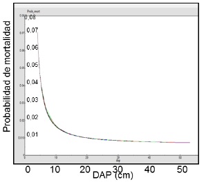 (11)Donde y son parámetros a estimar. Esta ecuación representa probabilidad de muerte que decae de manera aproximadamente exponencial a medida que los árboles alcanzan mayor diámetro. Por tanto, los árboles que mantienen bajos diámetros por estar sujetos a un alto grado de competencia, tienen mayor probabilidad de morir a medida que pasan los años.