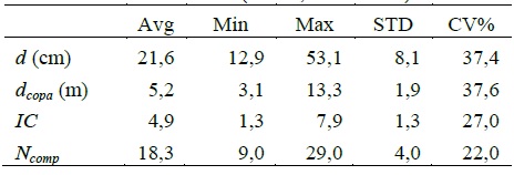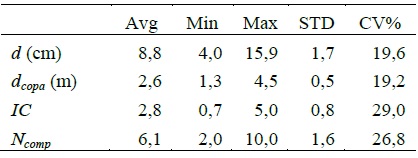 Se determinó la relación entre el d y el diámetro de copa bajo condiciones de crecimiento libre (es decir, árboles que crecieron sin estar sujetos a competencia). Para ello, se seleccionó una muestra de 104 árboles de entre 10 y 20 años de edad, distribuida en categorías diamétricas de 2,5 cm de amplitud creciendo de manera aislada o en cercas. Estos, fueron individuos sanos y no bifurcados a menos de 3 m de altura. A cada árbol se le midió d(cm), la altura total (m) y diámetros de copa (m).