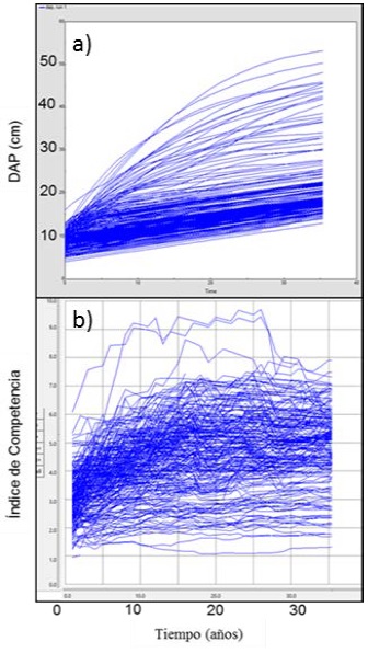 El crecimiento en d y dcopa para los árboles individuales muestran tendencia a mayor dispersión al final de la simulación (Tablas 3 y 4), consecuencia de que un porcentaje de árboles se mantuvieron en diámetros muy bajos debido a la competencia ejercida por los árboles de mayor tamaño.