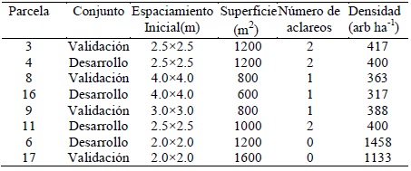 Los datos provienen de parcelas experimentales medidas en ocasiones sucesivas (desde los 1,8 a los 45 años de edad).Las parcelas son rectangulares con superficies entre 600 y 1600 m2, diferentes espaciamientos iniciales (2,0 x 2,0 a 4,0 x 4,0 m) y sometidas a diferentes regímenes de aclareo (remoción de árboles) en varias ocasiones (0 a 4) y con diferentes intensidades de extracción (20 a 50% de los árboles).Para estimar las relaciones de competencia se seleccionaron ocho parcelas permanentes caracterizadas por tener un índice de sitio de 23 m a la edad base de 16 años (Jerez y col., 1999). Las parcelas se separaron en cuatro grupos, considerando sus similitudes en cuanto a densidad, áreabasal y diámetro promedio (Jerez y col., 1999). En cada grupo se seleccionó aleatoriamente una parcela para desarrollar los modelos, quedando la restante paravalidación (Tabla 1).
