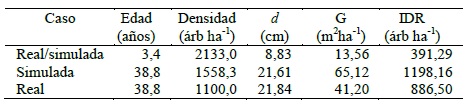 Como consecuencia de la alta competencia, el IDR se aproxima a los máximos observados en plantaciones de teca no sujetas a aclareos (Kumar y col., 1995, Jerez y col., 2003, Arias y Camacho 2004), sin embargo, el crecimiento real mostró un IDR considerablemente menor de alrededor de 887 árboles/ha. Igualmente, el dse corresponde con los diámetros observados para parcelas no aclareadas. No obstante, el área basal simulada es considerablemente mayor a la observada (65,1 contra 41,2 m2ha-1). En general, los rodales no aclareados de teca pueden alcanzar valores superiores a los 60 m2ha-1 en calidades de sitio I, pero en calidades de sitio inferiores, estos valores pueden estar por debajo de 40. Por otro lado, en general, el IDR máximo se considera no afectado por la calidad de sitio (Long y col., 2004). En todo caso, para efectos comparativos, el presente prototipo tiene la limitación de que considera la parcela como un rodal aislado, mientras que los datos disponibles son todos de parcelas que se han desarrollado dentro de una masa forestal, es decir, no tienen efecto de borde.